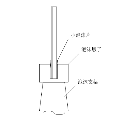 d.自制小型泡沫墩子,用于安裝被測(cè)材料樣板,如圖2所示。利用水平尺,貼合金屬板的表面,根據(jù)水平尺的指示調(diào)整小泡沫片,微調(diào)被測(cè)材料樣板的俯仰角度,將材料樣板平面垂直于地面擺放;